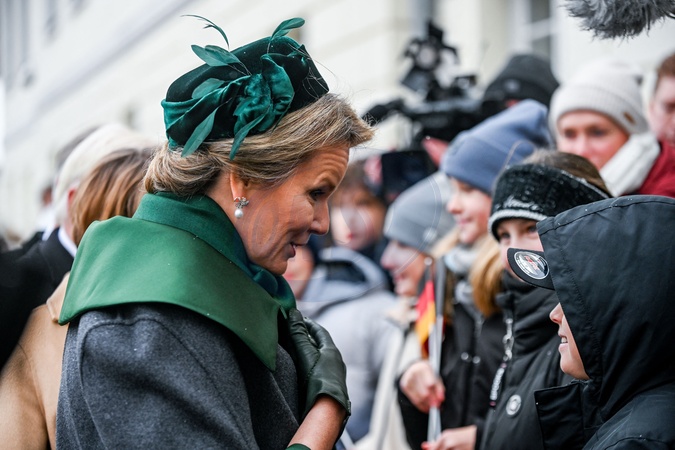 Le roi Philippe et la reine Mathilde de Belgique lors de leur visite officielle en Allemagne, le 5 décembre 2023. © Frédéric Andrieu/Bestimage Her Majesty The King Philippe and the Queen Mathilde take part of the State visit in Federal Republic of Germany for three days. Welcome Ceremony by HE Frank-Walter Steinmeier, President of the Federal Republic of Germany and Mrs. Elke Büdenbender, the First Lady Welcome by President Steinmeier and the First Lady Inspection of the troops by President Steinmeier and HM the King Short encounter with German school children for Their Majesties Presentation of the German and Belgian delegations Signing of the Visitor Book for Their Majesties © F.Andrieu / Agencepeps