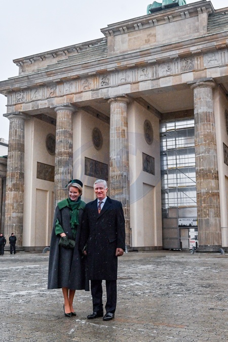 Le roi Philippe et la reine Mathilde de Belgique lors de leur visite officielle en Allemagne, le 5 décembre 2023. © Frédéric Andrieu/Bestimage Her Majesty The King Philippe and the Queen Mathilde take part of the State visit in Federal Republic of Germany for three days. Walk through the Brandenburger Tor with photo opportunity in presence of HE Kai Wegner, Governing Mayor of Berlin © F.Andrieu / Agencepeps