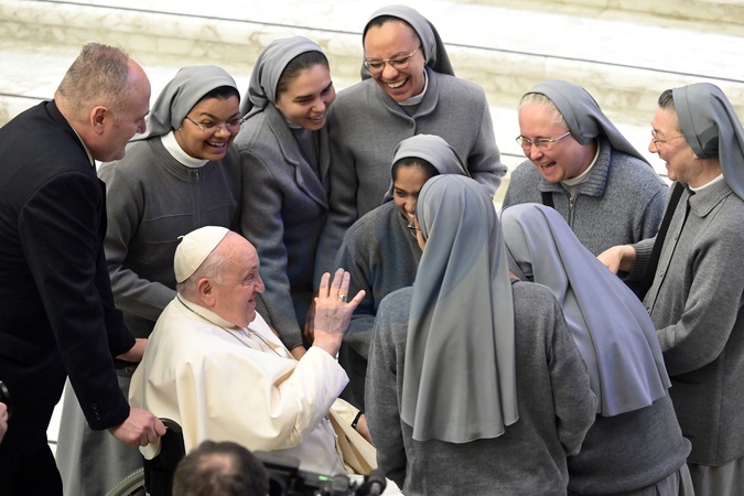 a group of nuns with Pope Francis attends the weekly general audience in Paul VI Hall, Vatican City, 06 December 2023., Credit:Maria Laura Antonelli / Avalon