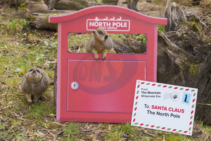 Meerkats explore a Christmas post box at Whipsnade Zoo, in Bedfordshire, UK. Picture date: Friday November 24, 2023., Credit:Dominic Lipinski / Avalon