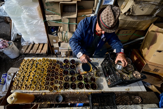 ZAPORIZHZHIA, UKRAINE - DECEMBER 5, 2023 - The 79-year-old volunteer who is known as Uncle Fedir pours melted wax from the kettle into tin cans filled with the strips of cardboard as he makes tin can lamps for the Ukrainian military at the Palyanytsya Volunteer Center, Zaporizhzhia, southeastern Ukraine., Credit:Dmytro Smolienko / Avalon