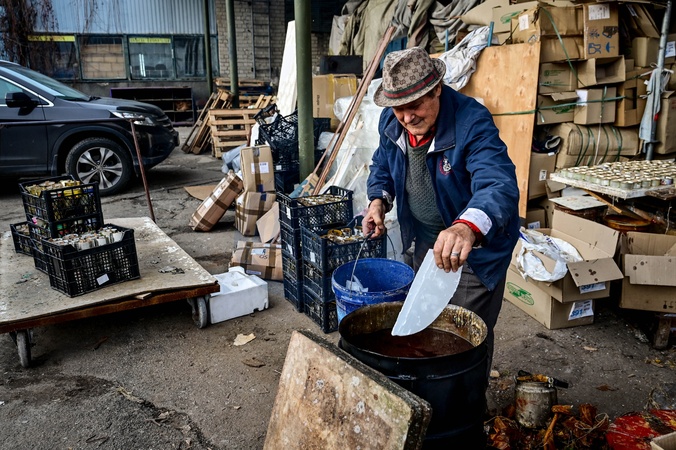 ZAPORIZHZHIA, UKRAINE - DECEMBER 5, 2023 - The 79-year-old volunteer who is known as Uncle Fedir adds a slap of paraffin wax into a barrel as he makes tin can lamps for the Ukrainian military at the Palyanytsya Volunteer Center, Zaporizhzhia, southeastern Ukraine., Credit:Dmytro Smolienko / Avalon