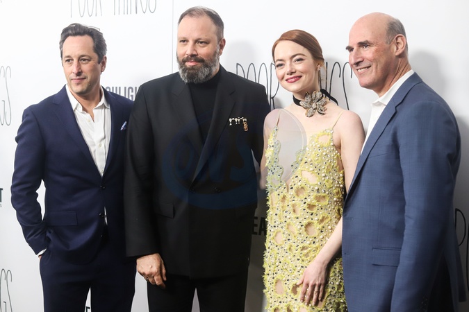 MANHATTAN, NEW YORK CITY, NEW YORK, USA - DECEMBER 06: David Greenbaum, Yorgos Lanthimos, Emma Stone and Matthew Greenfield arrive at the New York Premiere Of Searchlight Pictures' 'Poor Things' held at the DGA New York Theater on December 6, 2023 in Manhattan, New York City, New York, United States., Credit:Jordan Hinton / Avalon