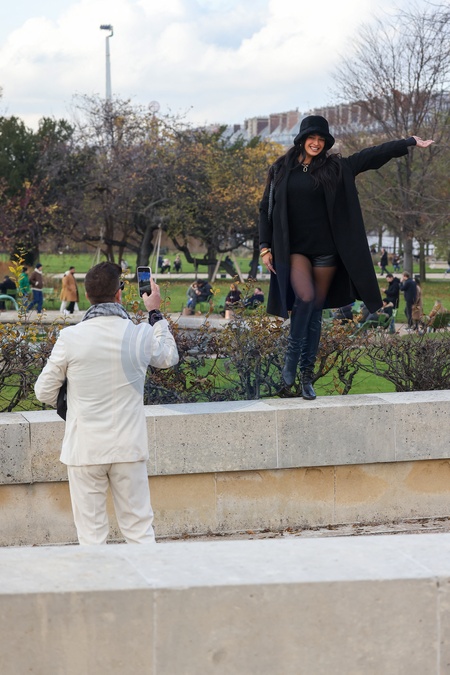 Exclusif - Prix Spécial - No web - Robin Thicke célèbre le 29ème anniversaire de sa compagne April Love Geary à Paris, le 6 décembre 2023. En couple depuis fin 2014, le chanteur américano-canadien de 46 ans n'a eu de cesse de photographier sa chère et tendre dans le jardin des Tuileries, en utilisant son téléphone mais aussi un appareil photo à usage unique. Les deux tourtereaux ont déjeuné au restaurant "Gigi" avant de regagner leur hôtel. © Cyril Moreau / Bestimage Exclusive - Special Price - No web - Robin Thicke celebrates the 29th birthday of his partner April Love Geary in Paris, December 6th, 2023. In a relationship since the end of 2014, the 46-year-old American-Canadian singer has never stopped photographing his beloved in the garden of Tuileries, using your phone but also a single-use camera. The two lovebirds had lunch at the "Gigi” restaurant before returning to their hotel.