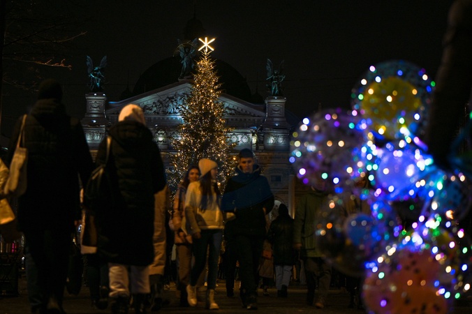 LVIV, UKRAINE - DECEMBER 5, 2023 - Members of the public attend the lighting of the Christmas tree presented by philanthropists from Bilohorshcha, a neighbourhood in Lviv, outside the Solomiya Krushelnytska Lviv National Academic Opera and Ballet Theatre ahead Saint Nicholas Day., Credit:Anastasiia Smolienko / Avalon