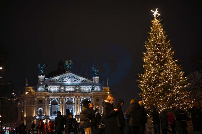 LVIV, UKRAINE - DECEMBER 5, 2023 - Members of the public attend the lighting of the Christmas tree presented by philanthropists from Bilohorshcha, a neighbourhood in Lviv, outside the Solomiya Krushelnytska Lviv National Academic Opera and Ballet Theatre ahead Saint Nicholas Day, Lviv, western Ukraine., Credit:Anastasiia Smolienko / Avalon
