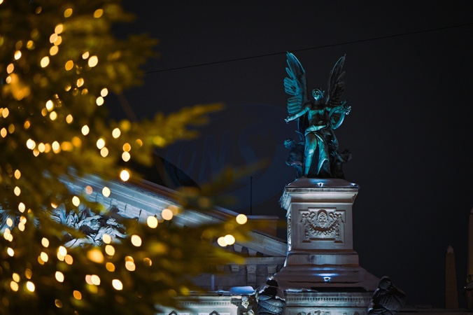 LVIV, UKRAINE - DECEMBER 5, 2023 - Illumination highlights a statue outside the Solomiya Krushelnytska Lviv National Academic Opera and Ballet Theatre during the lighting of the Christmas tree presented by philanthropists from Bilohorshcha, a neighbourhood in Lviv, western Ukraine. This photo cannot be distributed in the Russian Federation., Credit:Anastasiia Smolienko / Avalon