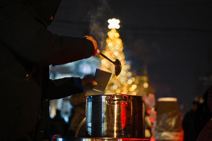 LVIV, UKRAINE - DECEMBER 5, 2023 - A vendor fills a cup with a steaming beverage during the lighting of the Christmas tree presented by philanthropists from Bilohorshcha, a neighbourhood in Lviv, in the square outside the Solomiya Krushelnytska Lviv National Academic Opera and Ballet Theatre, Lviv, western Ukraine., Credit:Anastasiia Smolienko / Avalon