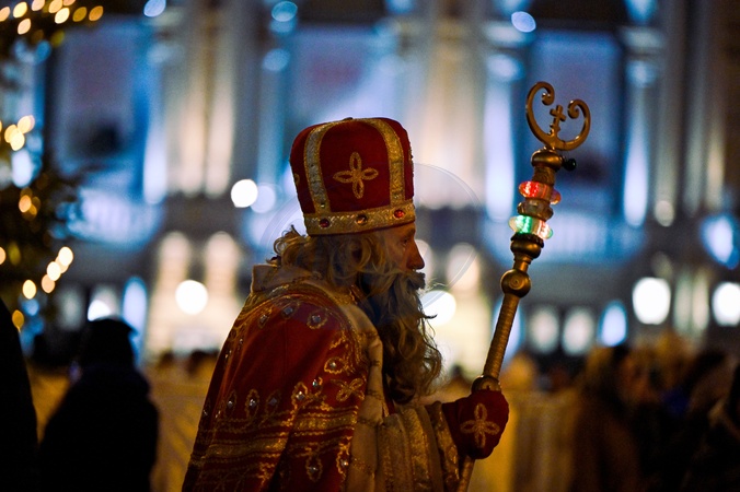 LVIV, UKRAINE - DECEMBER 5, 2023 - An actor dressed as Saint Nicholas is pictured during the lighting of the Christmas tree presented by philanthropists from Bilohorshcha, a neighbourhood in Lviv, in the square outside the Solomiya Krushelnytska Lviv National Academic Opera and Ballet Theatre, Lviv, western Ukraine. This photo cannot be distributed in the Russian Federation., Credit:Anastasiia Smolienko / Avalon