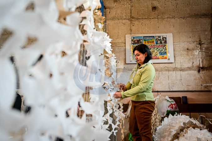 ZAPORIZHZHIA, UKRAINE - DECEMBER 5, 2023 - A volunteer puts the strips of white fabric onto netting as the Palyanytsya Volunteer Center makes winter camouflage netting for the Ukrainian military, Zaporizhzhia, southeastern Ukraine., Credit:Dmytro Smolienko / Avalon