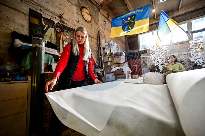ZAPORIZHZHIA, UKRAINE - DECEMBER 5, 2023 - Volunteer Valentyna Tyshkevych cuts white fabric into strips as the Palyanytsya Volunteer Center makes winter camouflage netting for the Ukrainian military, Zaporizhzhia, southeastern Ukraine., Credit:Dmytro Smolienko / Avalon