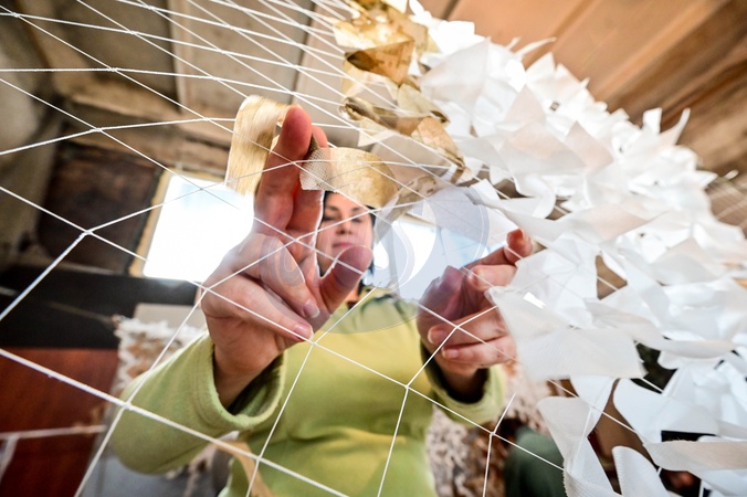 ZAPORIZHZHIA, UKRAINE - DECEMBER 5, 2023 - A volunteer puts the strips of white fabric onto netting as the Palyanytsya Volunteer Center makes winter camouflage netting for the Ukrainian military, Zaporizhzhia, southeastern Ukraine., Credit:Dmytro Smolienko / Avalon