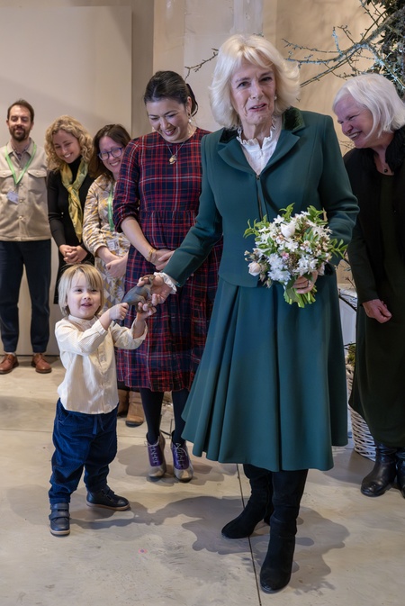 Queen Camilla opens Winter Flowers Week, a celebration of seasonal flowers and foliage, at the Garden Museum, London, United Kingdom, on 07 December 2023.Pic Shows 3 yr old Max Woodward playing tug of war with HM The Queen over his toy dinosaur when he was presented to HM, Credit:Paul Grover / Avalon