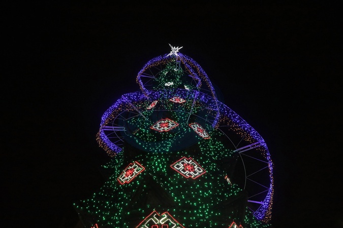 ODESA, UKRAINE - DECEMBER 6, 2023 - An actor dressed as Did Moroz (Ukrainian Santa Claus) and two dialogue police officers attend the lighting of the Christmas tree in Derybasivska Street on Saint Nicholas Day, Odesa, southern Ukraine., Credit:Nina Liashonok / Avalon
