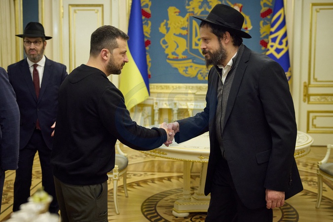 Le président ukrainien Volodymyr Zelensky et des représentants du clergé juif d'Ukraine participent à la cérémonie de Hanoukka à Kiev, en allumant la première bougie du memorah, le 7 décembre 2023. On the occasion of the beginning of the Jewish holiday of Hanukkah, President Volodymyr Zelenskyy and representatives of the Jewish clergy of Ukraine took part in the Hanukkah candle lighting ceremony. December 7th, 2023.