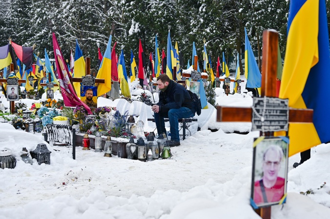 LVIV, UKRAINE - DECEMBER 6, 2023 - A man sits on the bench by the grave at the Lychakiv Cemetery during a ceremony in remembrance of the heroes who perished in the fight for a free and independent Ukraine on the Day of the Armed Forces of Ukraine, Lviv, western Ukraine., Credit:Anastasia Smolienko / Avalon