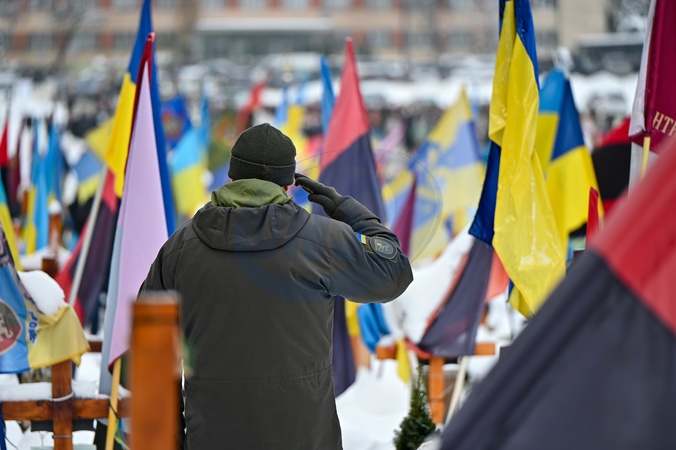 LVIV, UKRAINE - DECEMBER 6, 2023 - A serviceman salutes at the grave during a ceremony in remembrance of the heroes who perished in the fight for a free and independent Ukraine at the Lychakiv Cemetery on the Day of the Armed Forces of Ukraine, Lviv, western Ukraine., Credit:Anastasia Smolienko / Avalon