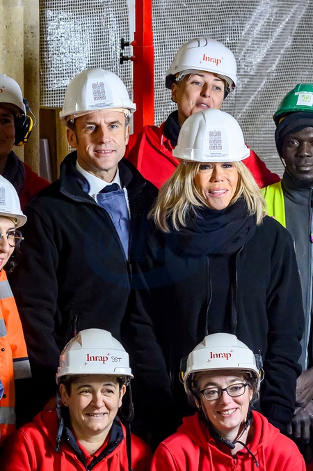 Le président de la République française Emmanuel Macron et sa femme la Première Dame Brigitte Macron avec des archéologues de l'Institut INRAP lors de la visite de la nef et du chœur de la Cathédrale Notre-Dame de Paris, France, le 8 décembre 2023. © Eric Tschaen/Pool/Bestimage French President and his wife visit the nave of the Notre-Dame de Paris Cathedral during its reconstruction, on the Ile de la Cite in Paris, France, on December 8, 2023.