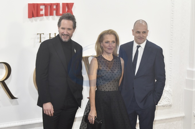 (L-R) Bertie Carvel, Gillian Anderson and Jonny Lee Miller attend the Finale Celebration for "The Crown" Season 6 at Southbank Centre, The Royal Festival Hall, Belvedere Road, Lambeth, London SE1 8XX on Tuesday 5 December 2023., Credit:Sue Andrews / Avalon