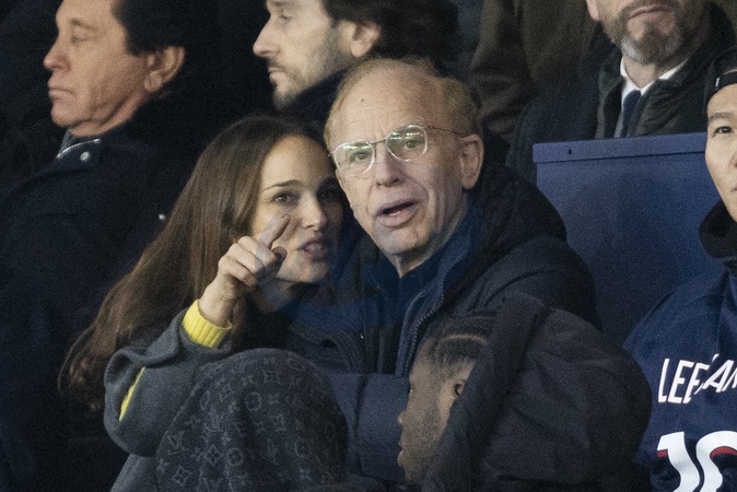 Natalie Portman et son père Avner Hershlag - Les célébrités assistent au match de football PSG - Nantes (2 - 1) au Parc des Princes à Paris, le 9 décembre 2023. © Cyril Moreau / Bestimage Celebrities attend the PSG - Nantes (2 - 1) football match at the Parc des Princes in Paris, December 9, 2023.