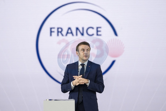 Le président Emmanuel Macron visite le site de Airbus à Toulouse à l'occasion des deux ans du plan d'investissement France 2030 le 11 décembre 2023. © Eliot Blondet / Pool / Bestimage French President Emmanuel Macron gestures as he addresses a speech during a visit to mark the two years of the France 2030 investment plan at the Airbus site in Toulouse, south-western France, on December 11, 2023.
