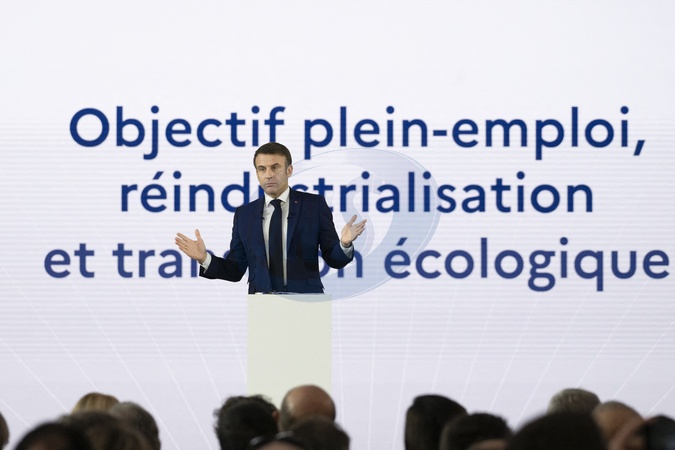Le président Emmanuel Macron visite le site de Airbus à Toulouse à l'occasion des deux ans du plan d'investissement France 2030 le 11 décembre 2023. © Eliot Blondet / Pool / Bestimage French President Emmanuel Macron gestures as he addresses a speech during a visit to mark the two years of the France 2030 investment plan at the Airbus site in Toulouse, south-western France, on December 11, 2023.