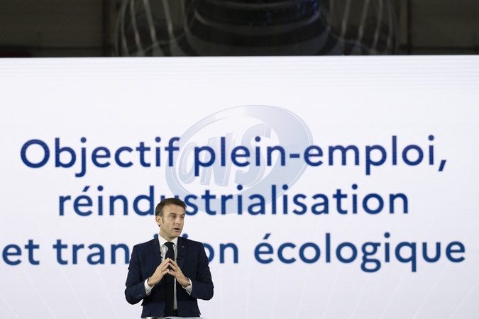Le président Emmanuel Macron visite le site de Airbus à Toulouse à l'occasion des deux ans du plan d'investissement France 2030 le 11 décembre 2023. © Eliot Blondet / Pool / Bestimage French President Emmanuel Macron gestures as he addresses a speech during a visit to mark the two years of the France 2030 investment plan at the Airbus site in Toulouse, south-western France, on December 11, 2023.