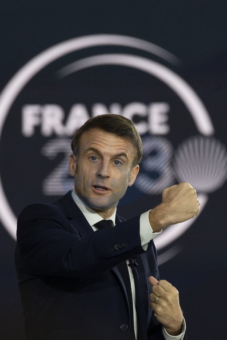 Le président Emmanuel Macron visite le site de Airbus à Toulouse à l'occasion des deux ans du plan d'investissement France 2030 le 11 décembre 2023. © Eliot Blondet / Pool / Bestimage French President Emmanuel Macron gestures as he addresses a speech during a visit to mark the two years of the France 2030 investment plan at the Airbus site in Toulouse, south-western France, on December 11, 2023.