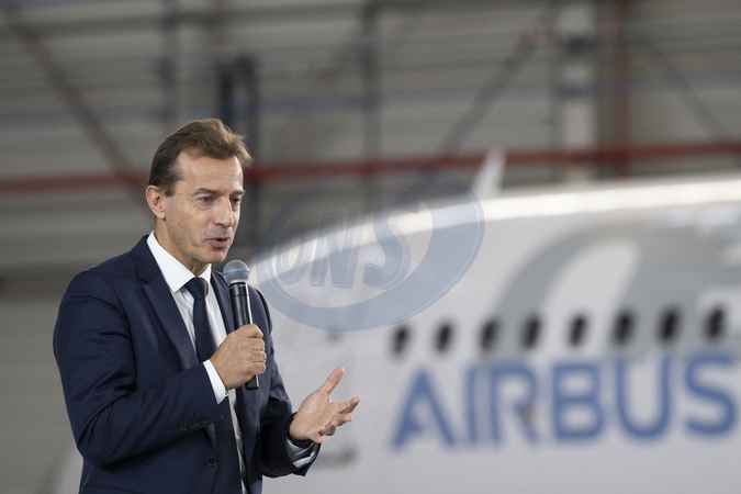 Le président Emmanuel Macron visite le site de Airbus à Toulouse à l'occasion des deux ans du plan d'investissement France 2030