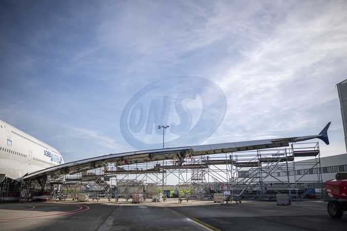 Le président Emmanuel Macron visite le site de Airbus à Toulouse à l'occasion des deux ans du plan d'investissement France 2030 le 11 décembre 2023. © Eliot Blondet / Pool / Bestimage dismantling of an AIRBUS A380 for tests using a new type of fuel «100% sustainable aviation fuel on board» during a french president visit to mark the two years of the France 2030 investment plan at the Airbus site in Toulouse, south-western France, on December 11, 2023.