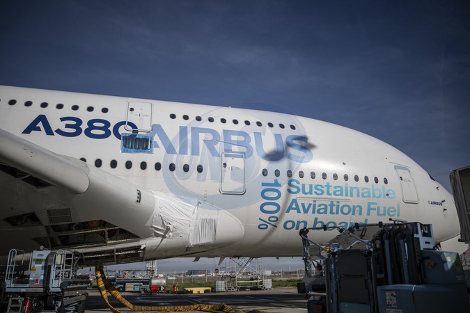 Le président Emmanuel Macron visite le site de Airbus à Toulouse à l'occasion des deux ans du plan d'investissement France 2030 le 11 décembre 2023. © Eliot Blondet / Pool / Bestimage dismantling of an AIRBUS A380 for tests using a new type of fuel «100% sustainable aviation fuel on board» during a french president visit to mark the two years of the France 2030 investment plan at the Airbus site in Toulouse, south-western France, on December 11, 2023.