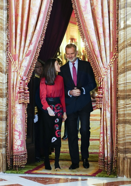 Król Felipe VI i królowa Letizia podczas spotkania zarządu Fundacji Księżnej Girony w Pałacu Królewskim w Madrycie