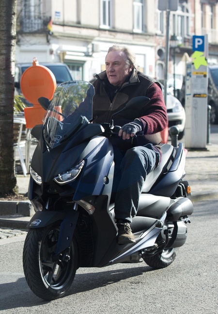 No Credit - Bi - Exclusif - Gérard Depardieu, amaigi, sans casque sur son scooter dans les rues de Bruxelles en empruntant mêmes des sens interdits