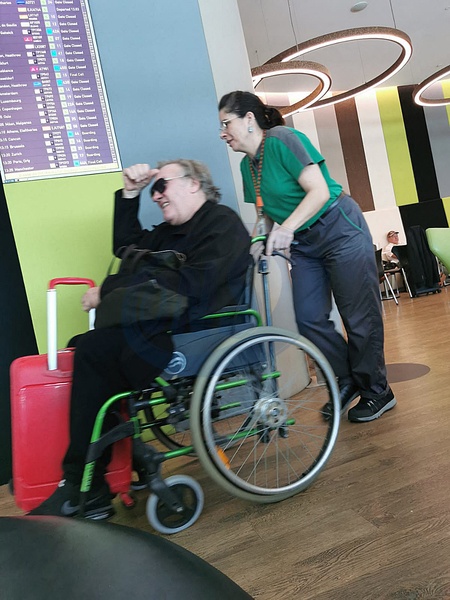 Exclusif - Prix Special - No Web - Gérard Depardieu, que tout le monde cherche, a été aperçu, transporté en chaise roulante, dans la zone VIP de l'aéroport de Lisbonne