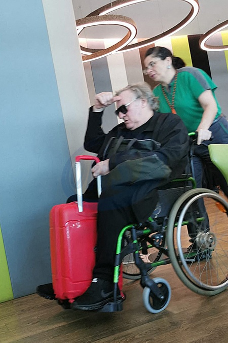 Exclusif - Prix Special - No Web - Gérard Depardieu, que tout le monde cherche, a été aperçu, transporté en chaise roulante, dans la zone VIP de l'aéroport de Lisbonne