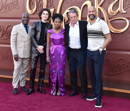 Paterson Joseph, Timothee Chalamet, Calah Lane, Hugh Grant and Keegan Michael Key arriving at the "Wonka” domestic premiere held at the Regency Village Theatre on December 10, 2023 in Westwood, Ca.© Lisa OConnor/AFF-USA.com