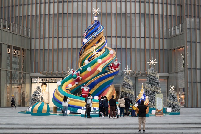 A view of a artistic Christmas Tree set up outside a high-end department store in Shanghai, China Wednesday, Dec. 13, 2023., Credit:WANG GANG / Avalon