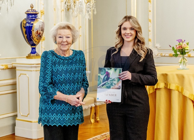 La princesse Beatrix des Pays-Bas a reçu le premier calendrier du Royaume créé par des étudiants de l'Université des Sciences Appliquées de La Haye aux Pays-Bas le 15 décembre 2023. 15–12-2023, The Hague Princess Beatrix received the first Kingdom Calendar .The birthday calendar was created by students from The Hague University of Applied Sciences, who are following the minor in Kingdom Affairs. The calendar has been compiled with photos from Dutch Caribbean Nature Alliance (DCNA) and contains the mention of festive days for the Kingdom. The presentation will take place at Noordeinde Palace in The Hague, on Kingdom Day. Princess Beatrix is patroness of DCNA. Copyright: Royalportraits Europe/Bernard Ruebsamen