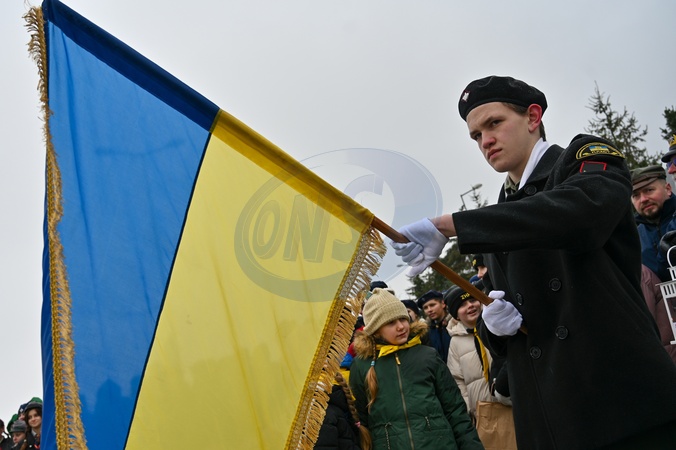 LVIV REGION, UKRAINE - DECEMBER 14, 2023 - A scout holds a flag of Ukraine as Polish scouts give the Peace Light of Bethlehem to Ukrainian Plast scouts in the international zone at the Rava-Ruska-Hrebenne checkpoint at the Ukraine-Poland border, Lviv Region, western Ukraine., Credit:Anastasiia Smolienko / Avalon