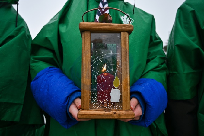 LVIV REGION, UKRAINE - DECEMBER 14, 2023 - A person holds a lantern with a burning candle as Polish scouts give the Peace Light of Bethlehem to Ukrainian Plast scouts in the international zone at the Rava-Ruska-Hrebenne checkpoint at the Ukraine-Poland border, Lviv Region, western Ukraine., Credit:Anastasiia Smolienko / Avalon