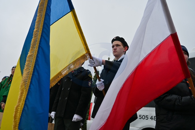 LVIV REGION, UKRAINE - DECEMBER 14, 2023 - Scouts hold the flags of Ukraine and Poland as Polish scouts give the Peace Light of Bethlehem to Ukrainian Plast scouts in the international zone at the Rava-Ruska-Hrebenne checkpoint at the Ukraine-Poland border, Lviv Region, western Ukraine., Credit:Anastasiia Smolienko / Avalon