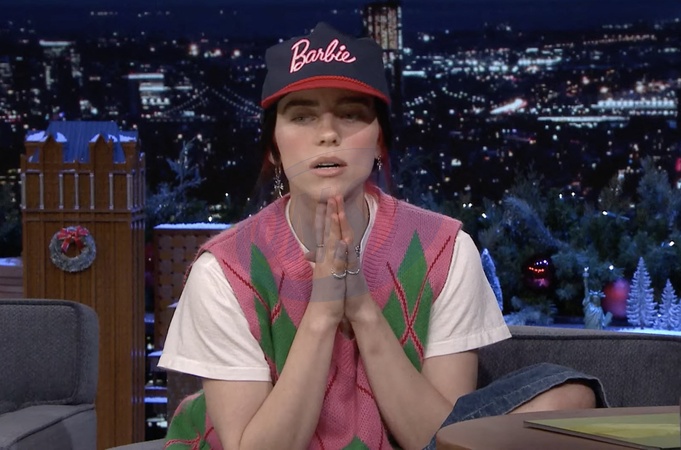 Pictures MUST credit: NBC Singer Billie Eilish has told how the Barbie movie hit song What Was I Made For was forged in one sitting with her brother and co-writer Finneas O'Connell. The song topped the charts in the USA for 14 weeks and has been streamed more than two billion times. The tune comes in at the end of the blockbuster after Barbie, played by Margot Robbie decides she wants to be human. Eilish, 21, spoke about the writing of it when she appeared on the Jimmy Fallon Talk show after the song got five Grammy nominations including song of the year. She and Finneas, 26, were invited by the movie's director Greta Gerwig to see some scenes from the then uncompleted movie before being shown the part that required the song. Eilish, in Barbie baseball cap, knee length baggy shorts and a golfer's style pink and green patterned sleeveless sweater , sat cross legged to speak to Fallon. Picture supplied by JLPPA