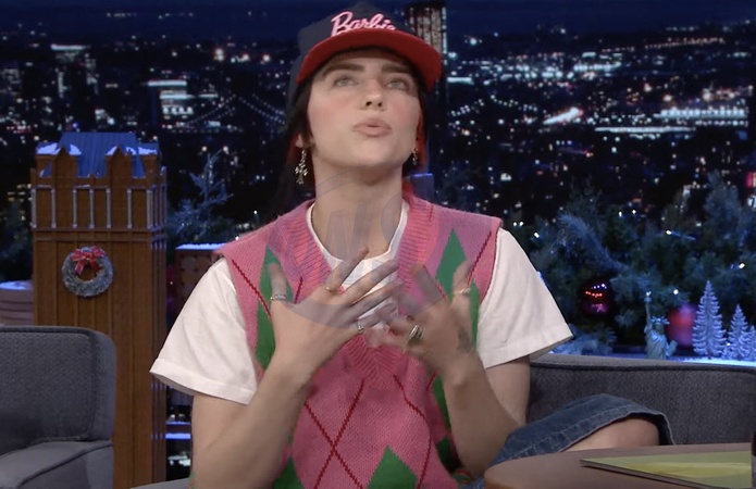 Pictures MUST credit: NBC Singer Billie Eilish has told how the Barbie movie hit song What Was I Made For was forged in one sitting with her brother and co-writer Finneas O'Connell. The song topped the charts in the USA for 14 weeks and has been streamed more than two billion times. The tune comes in at the end of the blockbuster after Barbie, played by Margot Robbie decides she wants to be human. Eilish, 21, spoke about the writing of it when she appeared on the Jimmy Fallon Talk show after the song got five Grammy nominations including song of the year. She and Finneas, 26, were invited by the movie's director Greta Gerwig to see some scenes from the then uncompleted movie before being shown the part that required the song. Eilish, in Barbie baseball cap, knee length baggy shorts and a golfer's style pink and green patterned sleeveless sweater , sat cross legged to speak to Fallon. Picture supplied by JLPPA