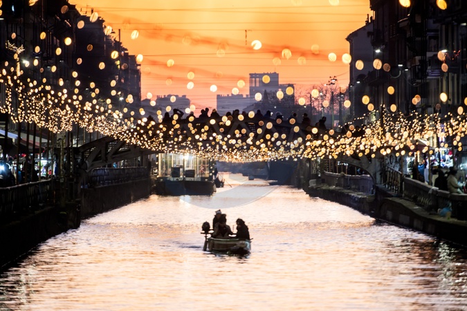Christmas lights at sunset on the Naviglio Grande, Milan 16 Dec 2023, Credit:Nicola Marfisi / Avalon