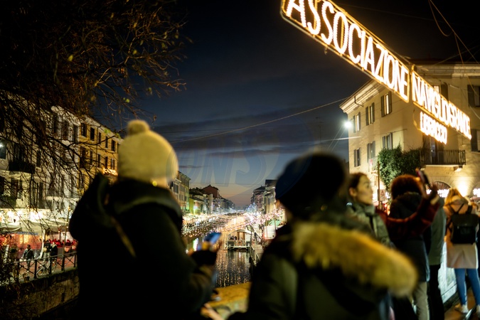 Christmas lights at sunset on the Naviglio Grande, Milan 16 Dec 2023, Credit:Nicola Marfisi / Avalon