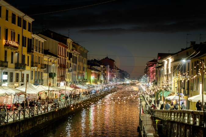 Christmas lights at sunset on the Naviglio Grande, Milan 16 Dec 2023, Credit:Nicola Marfisi / Avalon