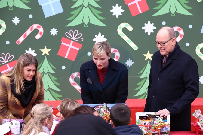 No Tabloïds - Camille Gottlieb, La princesse Charlène de Monaco, Le prince Albert II de Monaco - Remise de cadeaux de Noël aux enfants de la principauté dans la cour d'honneur du palais de Monaco, le 20 décembre 2023. © JC Vinaj / Pool / Bestimage No Tabloïds - Presentation of Christmas gifts to the children of the principality in the main courtyard of the Palace of Monaco, December 20, 2023.
