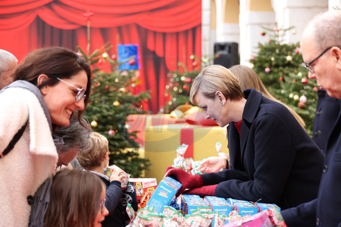 No Tabloïds - Le prince Albert II de Monaco et La princesse Charlène de Monaco - Remise de cadeaux de Noël aux enfants de la principauté dans la cour d'honneur du palais de Monaco, le 20 décembre 2023. © JC Vinaj / Pool / Bestimage No Tabloïds - Presentation of Christmas gifts to the children of the principality in the main courtyard of the Palace of Monaco, December 20, 2023.