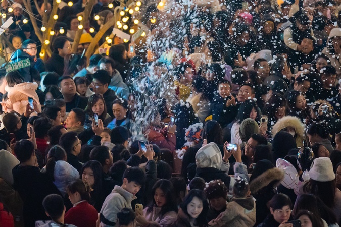 People celebrate Christmas Eve amidst manmade snow outside a shopping mall in southwest China's Chongqing Municipality Sunday, Dec. 24, 2023., Credit:LI HONGBO / Avalon