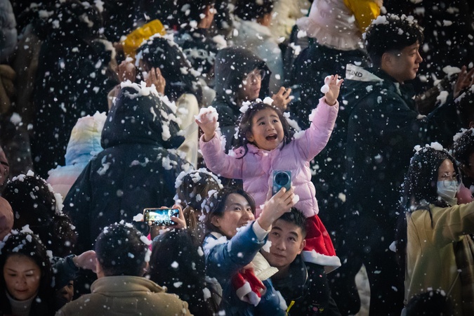 People celebrate Christmas Eve amidst manmade snow outside a shopping mall in southwest China's Chongqing Municipality Sunday, Dec. 24, 2023., Credit:LI HONGBO / Avalon